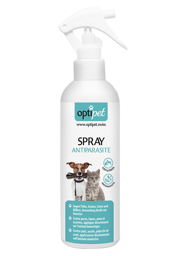 Der OptiPet Spray ANTIPARASITE wirkt abweisend gegen Flöhe, Zecken, Läuse und Milben.