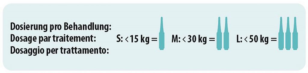 Dosierungsangaben je Körpergewicht beachten. Den Pipettenspitz mit einer Schere aufschneiden, Fell teilen und den gesamten Inhalt der Pipette im Nacken direkt auf die Haut auftragen. Behandlung alle 4 Wochen wiederholen. Bei Parasitenbefall wiederholen Sie die Anwendung alle 7 Tage sowie nach dem Baden.